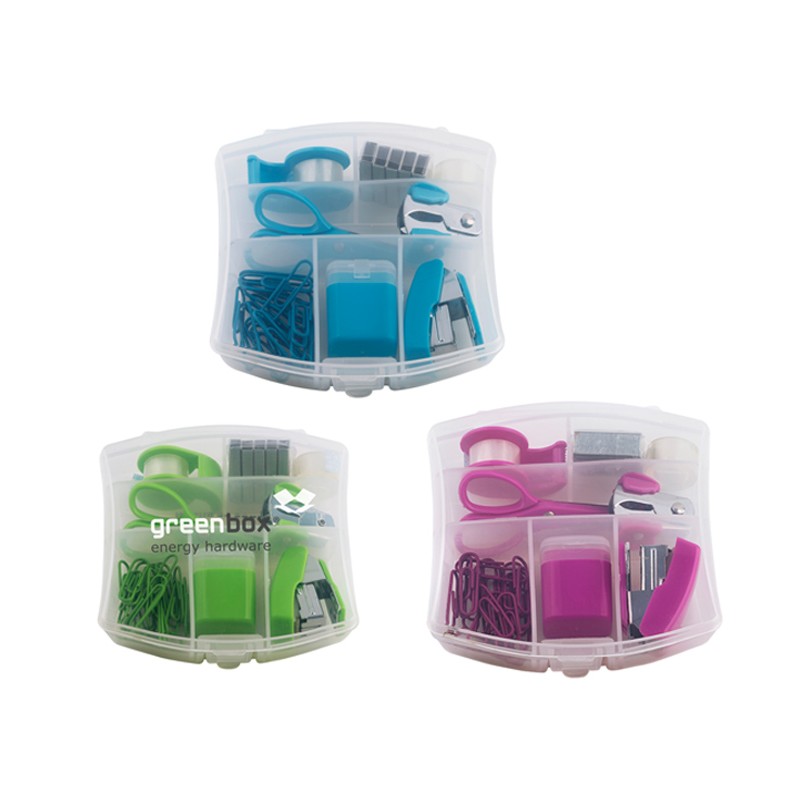 Descripción:Set promocional de escritorio indispensable. Incluye clips para papel, sacapuntas, mini engrapadora, grapas, saca grapas, tijeras, mini despachador de cinta adhesiva y cinta de respuesto. Presentación: estuche de plástico transparente. Material: box: plastic others: plastic + metal.